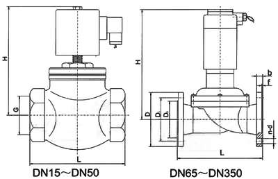 本阀DNl5—50系一次开阀的直动式低压电磁阀,DN65—300系二次开阀的先导式电磁阀。直动式电磁阀在接受电信号后,电磁力直接将阀塞提起,介质流通;断电后,电磁力消失,阀塞在自重和弹簧力作下下落,介质断流。